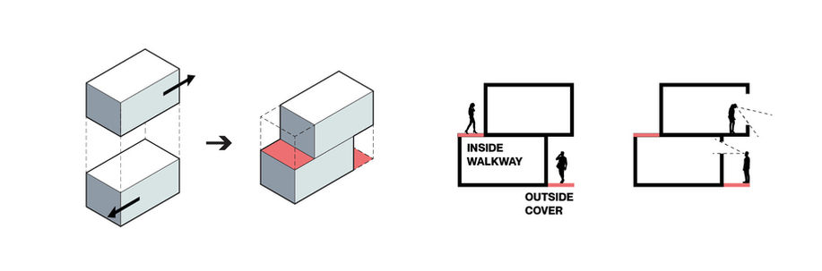 These block-based toys were experimented with to create a simple box stacking system, where an outdoor covered area is created alongside and indoor first floor walkway. This is a response to the utilisation of street interface and internal spatial organisation.